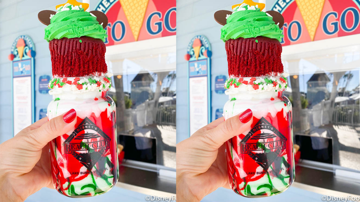 "The shake comes served in a classic Mason jar-style plastic souvenir cup, swirled on the inside with red and green colored syrups," Disney Food Blog reports. "The top of the cup is covered in frosting and Christmas sprinkles, with a red velvet cupcake wedged inside. The cupcake is also topped with green vanilla frosting and a golden star, almost like a Christmas tree—but with chocolate Mickey ears."